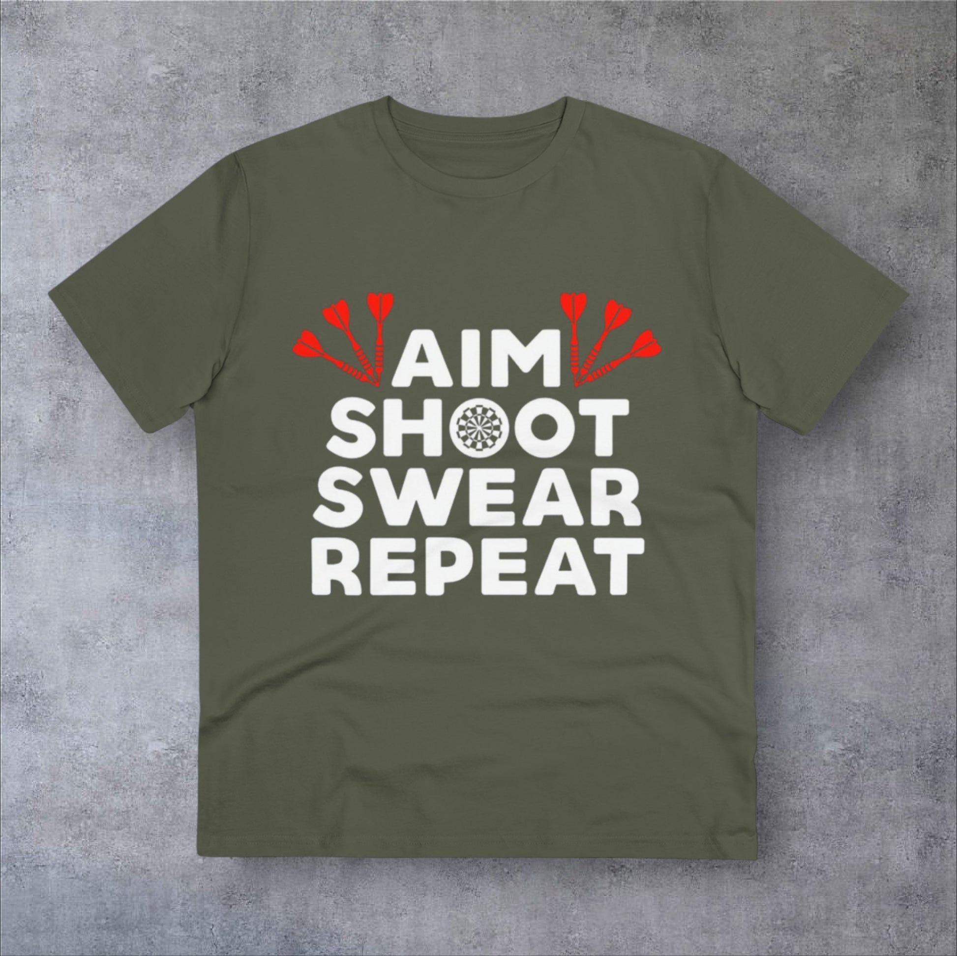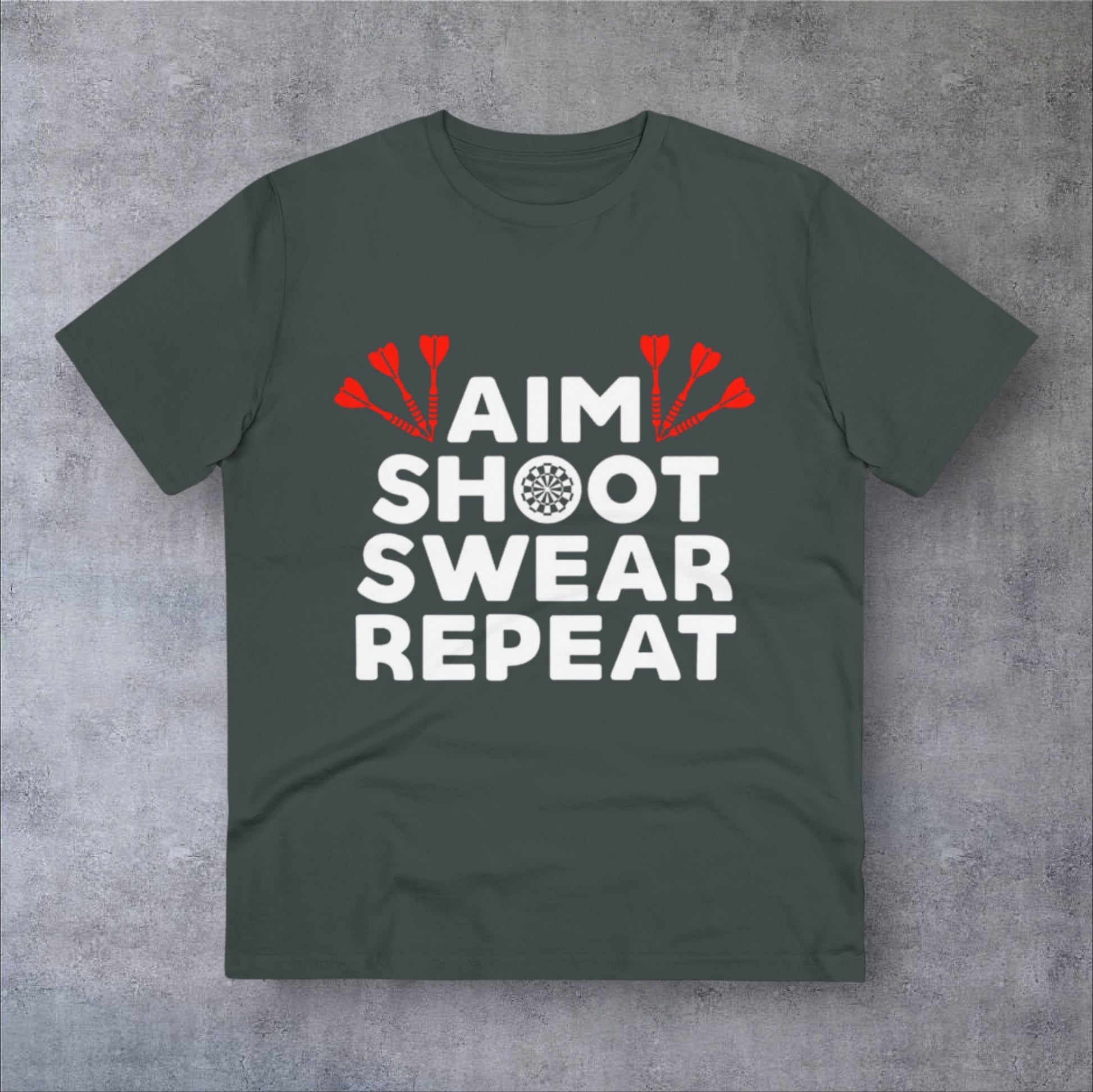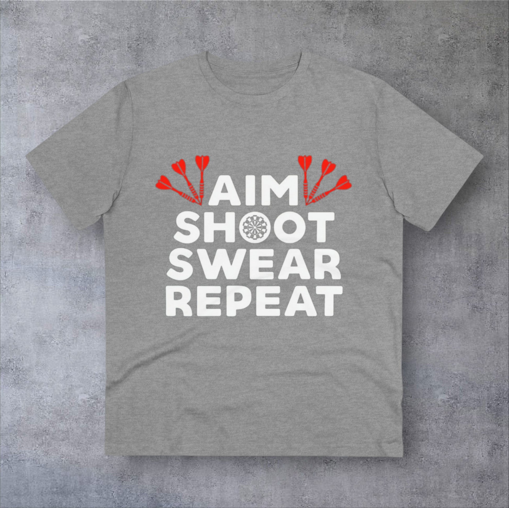 Introducing the Aim, Shoot, Swear, Repeat | T-SHIRT – a playful and comfy tee for dart enthusiasts. Featuring a humorous mantra on the front, this shirt captures the ups and downs of the game with a touch of wit. Crafted from quality cotton, it's perfect for casual wear or dart practice. Embrace the lighter side of darting with this fun and stylish tee.
